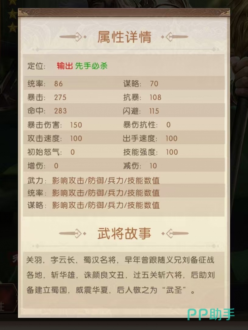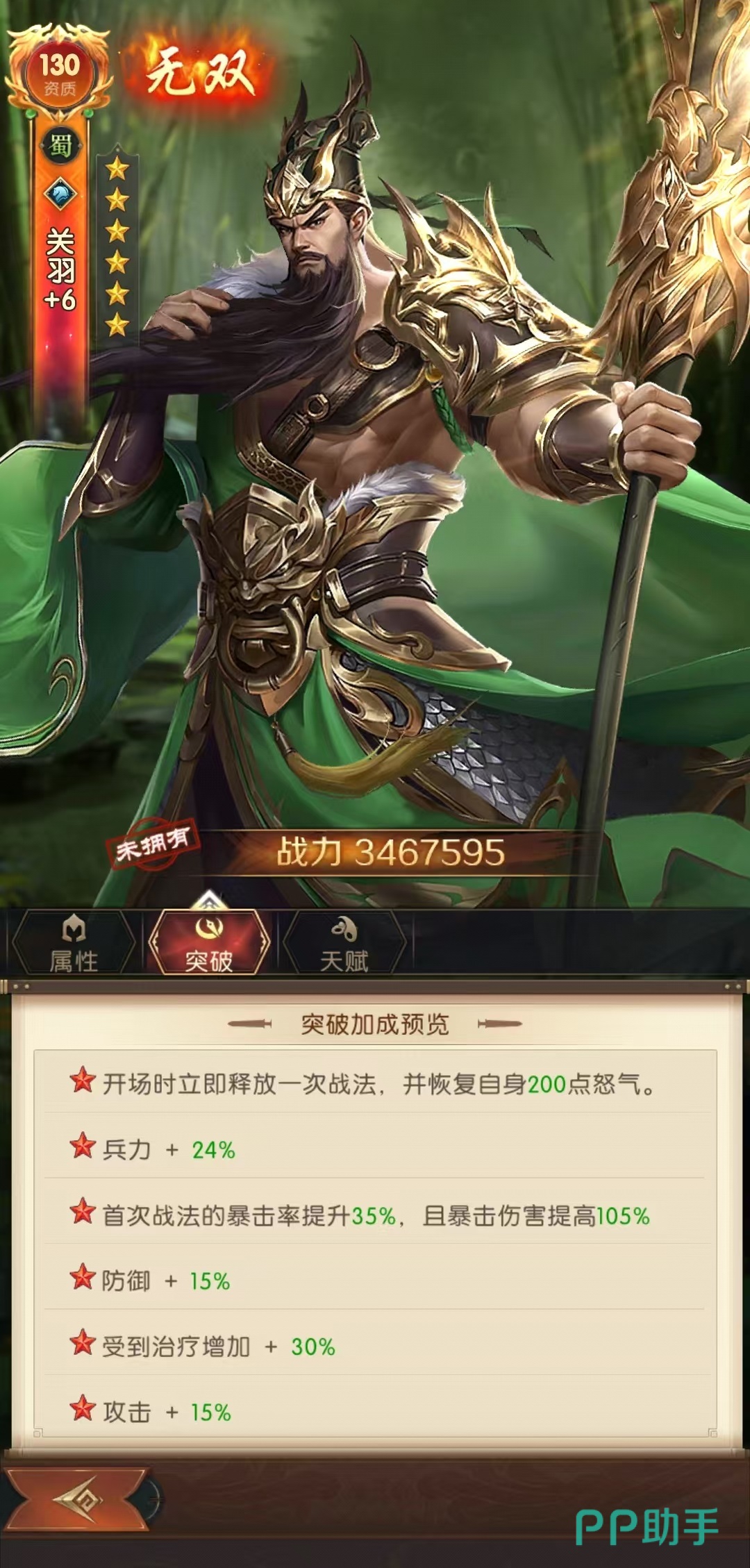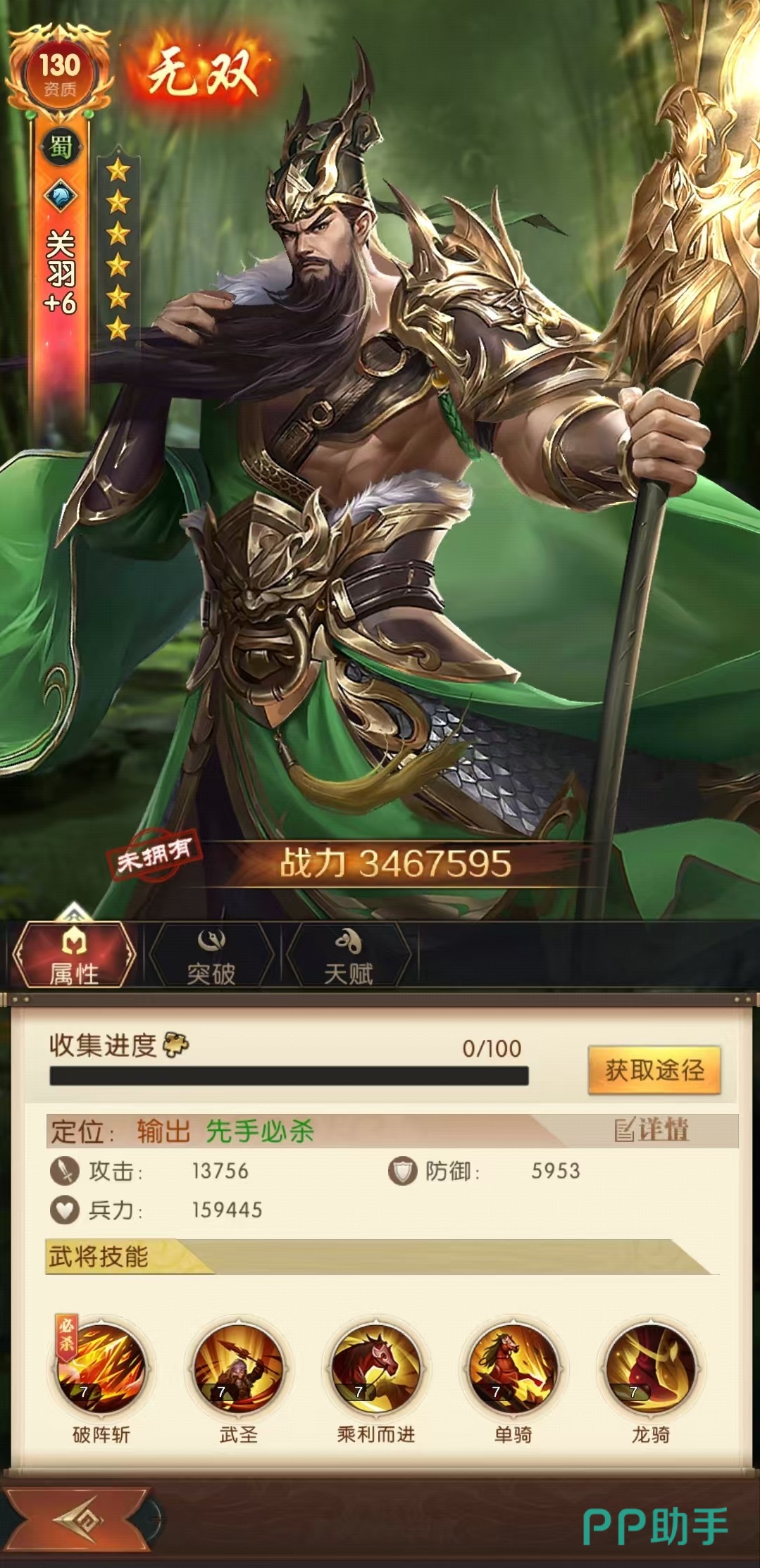 关羽在游戏中的定位是属于先手必杀类型的输出,因为自身资质高,所以属性方面非常出色,比其他的橙卡英雄都要强势一些。在进行突破之后,开场直接释放战法并恢复自身怒气,首次战法的暴击率和暴击伤害都有提升,所以在关羽第1次出手的时候就可以造成很大的伤害。他自身的必杀技是破阵斩,发动一次青龙偃月斩,对纵排敌人造成高达522.5%攻击力的伤害,阵容中蜀国武将越多,伤害也就越高。