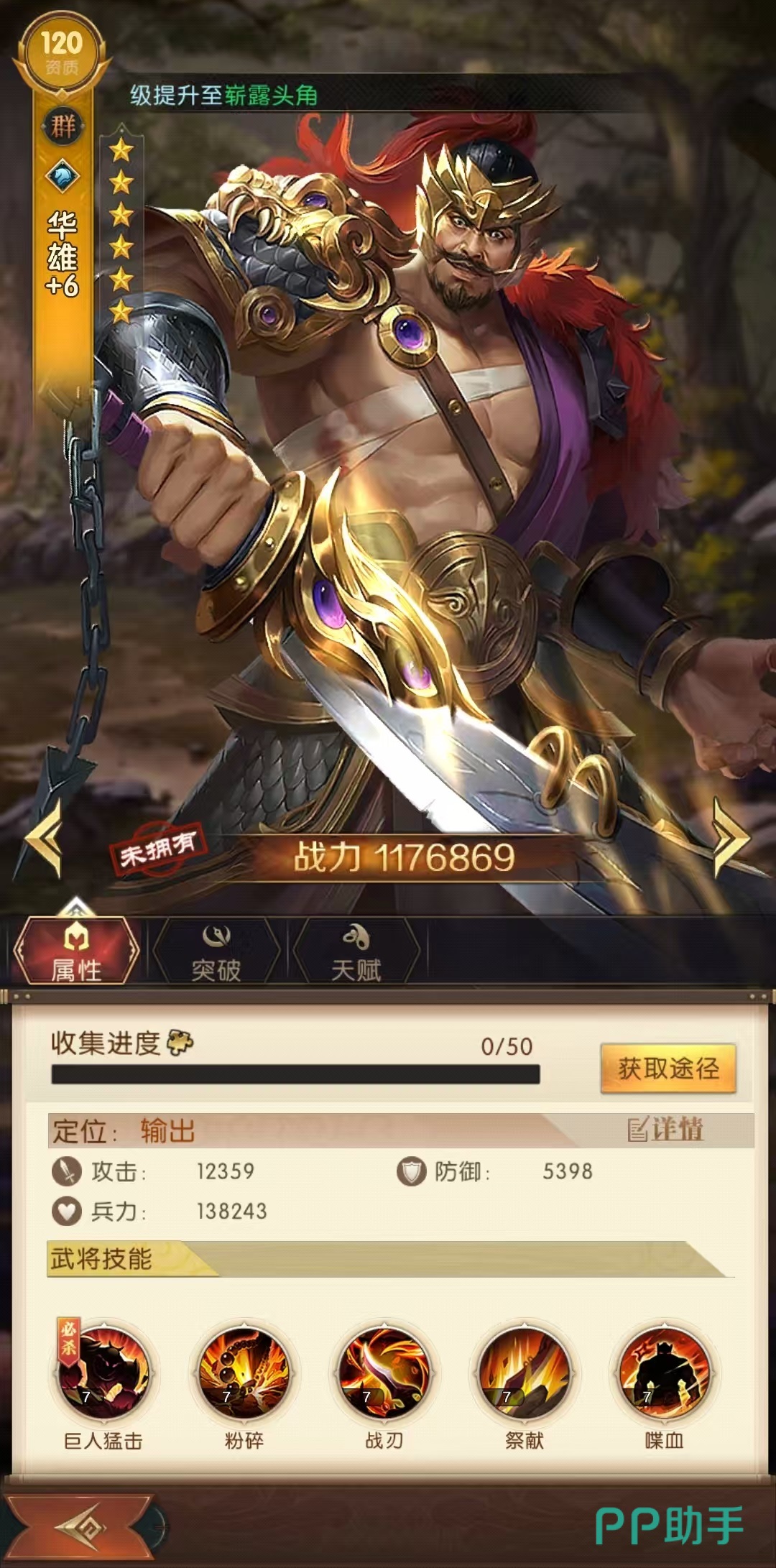 华雄是属于普通的输出类型,他的必杀技巨人猛击,可以对当前目标造成一次722.64%攻击力数值的伤害,对于处于流血状态的单位额外提升40%。第1个被动粉碎,在释放大招后,有机率额外释放一次,最多能额外触发两次。所以说华雄也是一个比较考验运气的武将,如果运气够好,可以做到大招连续释放,那么对敌方将是很大的打击。