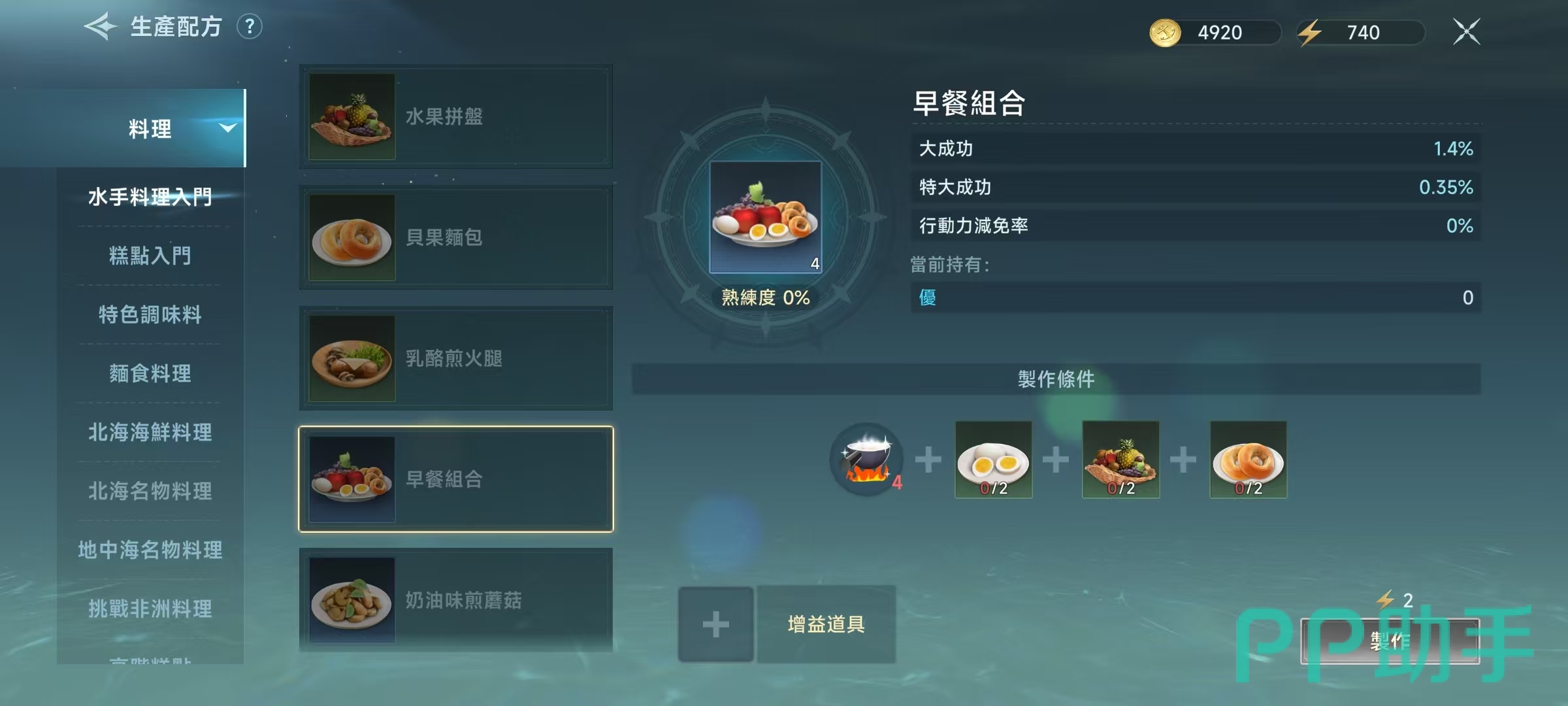 解锁了配方之后,制作时候还需要满足一定的条件,例如需要对应的烹饪技能和对应原材料。以最简单的水煮蛋为例,它就需要一份盐和一个鸡蛋才能制作出来。如果想要制作早餐组合,那么需要两个水煮蛋,两个水果拼盘和两个贝果面包。