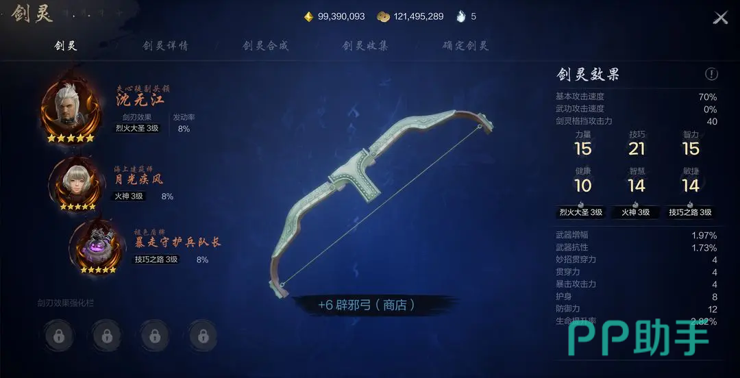 剑灵2弓的剑灵搭配推荐的就是以上这些了,他们都是至尊级别的极品灵魂,短时间内很难集齐,需要大家日复一日、持之以恒的去玩和抽卡才可以集齐,在此之前可以先随便使用一些能提升技巧的蓝色、紫色品质灵魂过渡一下,等满级以后、资源比较丰富了,再去追求完美阵容。