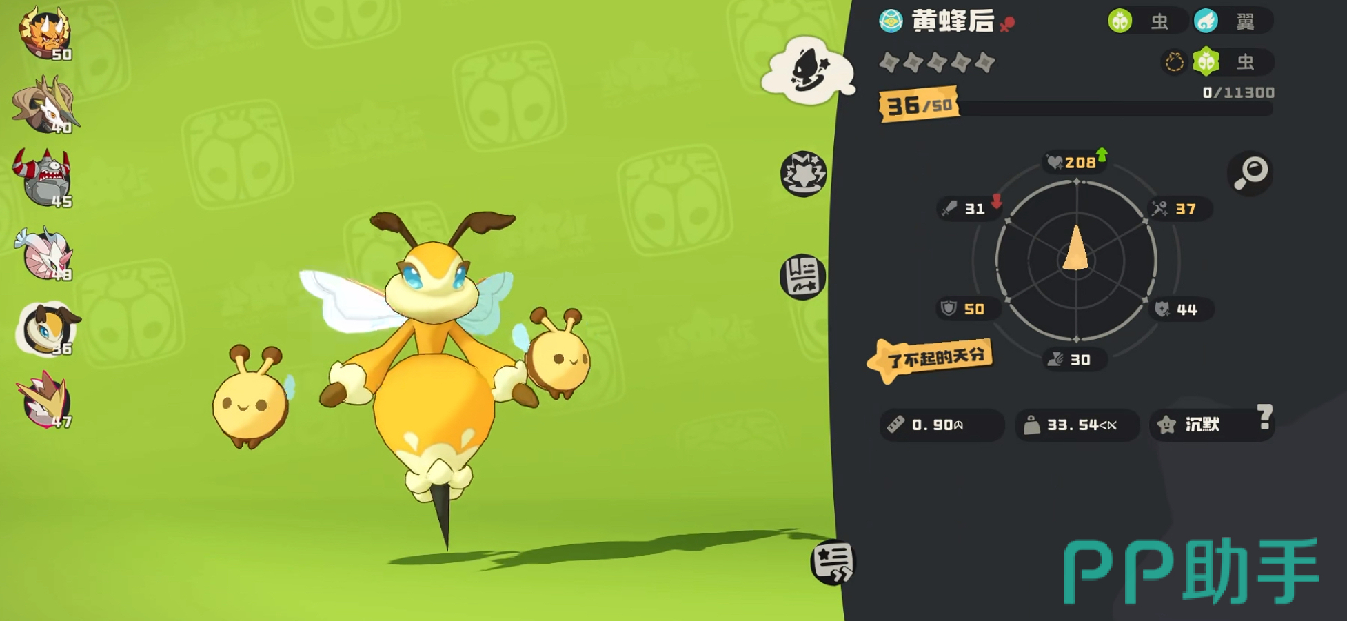 黄蜂后的种族值都是非常不错的,双抗都是100以上,唯一不足的就是速度,只有40。所以在作战中,黄蜂后可以当做肉盾辅助,在前排为队友抗伤害。黄蜂后技能“铜墙铁壁”可以提高自身的魔抗防御等级,再加上自身的回血技能“回天”,让它的生存属性直接爆表!黄蜂后比较适合消耗流,在团队作战中可以帮助队友消耗敌方状态,非常适合走策略消耗流的玩家培养。