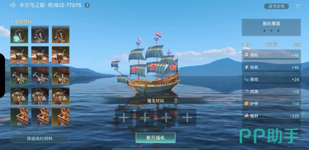 战船跟其他的船只相比强化方面有着很多的不同之处,首先就是炮舰的不同,我们在强化炮舰的时候必须要够硬,可是当我们打开强化选项面板时会发现面板上并没有关于炮舰强化的选项,强化选项中没有攻击的只有防御和性能方面的,大体上分为横帆、纵帆、转向、抗浪、护甲、船耐等6个强化方面。
