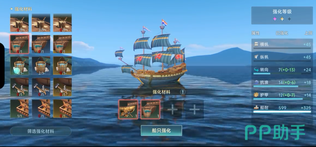 横帆和纵帆虽然也决定着战船的移动速度,可小编认为这两个强化点的影响并没有抗浪大,在这三个强化点中,优先建议强化抗浪,抗浪越高,战船在战斗地图中的移动速度就越快。