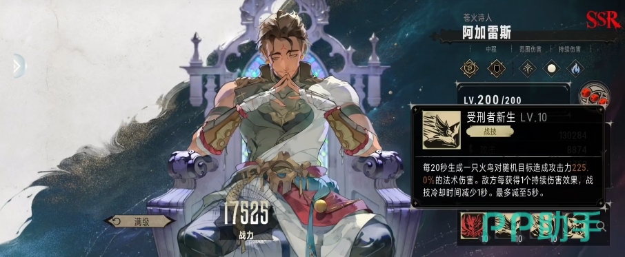 除了强大的奥义技能之外,阿加雷斯的战技受刑者新生也是他的重要战斗手段之一,这一技能允许他每12秒主动释放一次,释放出强大的火焰力量,生成一只炽热的火鸟对随机目标进行打击,这只火鸟每次出现都会对敌人造成攻击力180.0%的法术伤害,而当玩家将这一技能升级之后,火鸟的威力也会得到提升,升级后的受刑者新生能够造成高达270.0%的法术伤害,使得阿加雷斯在战斗中的输出能力更加稳定。