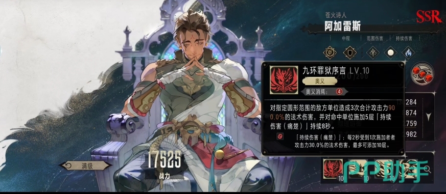 阿加雷斯的奥义技能叫做九环罪狱序言,当他释放这一技能时,会对主目标周围3.5米圆形范围内的敌方单位造成输出,具体来说就是这一技能会发动3段攻击,每段都能造成攻击力300.0%的法术伤害,总计高达900.0%的法术伤害率,这样的输出能力在同类型角色中绝对是第一梯队的,更恐怖的是,这一技能还会对命中的敌人施加2层持续伤害,也就是罪灼状态效果,这种持续伤害效果会在接下来的8秒内持续发挥作用,而当玩家将这一技能升级之后,升级后的九环罪狱序言能够造成450.0%的单段法术伤害,三段总伤害率更是达到了惊人的1350.0%。