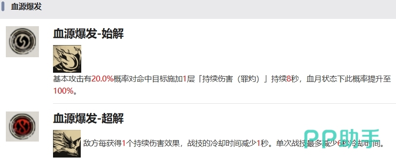 而当阿加雷斯开启血源爆发后的能力分为始解与超解,始解状态下,阿加雷斯的基本攻击将获得一种特殊效果:每次攻击都有20.0%的概率对命中目标施加1层持续伤害,也就是罪灼的效果,这种效果会持续8秒,让敌人在这段时间内持续承受伤害,更为重要的是在血月状态下,这个概率将大幅提升至100%,几乎每次攻击都能附加上持续伤害效果。