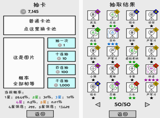 这款简单的抽卡游戏,既是满足大家需求的,也是以抽卡。这种简单玩法为主的,因为只有不断的抽卡以后,你才能获得里面的各种角色,在对战的时候可以打败对手。以简约的火柴人进行设计,你要做的就是一直不断的抽卡,无论是普通卡池里面,还是更高级的你,都能通过获得多次连抽的机会,得到更多的抽取结果。