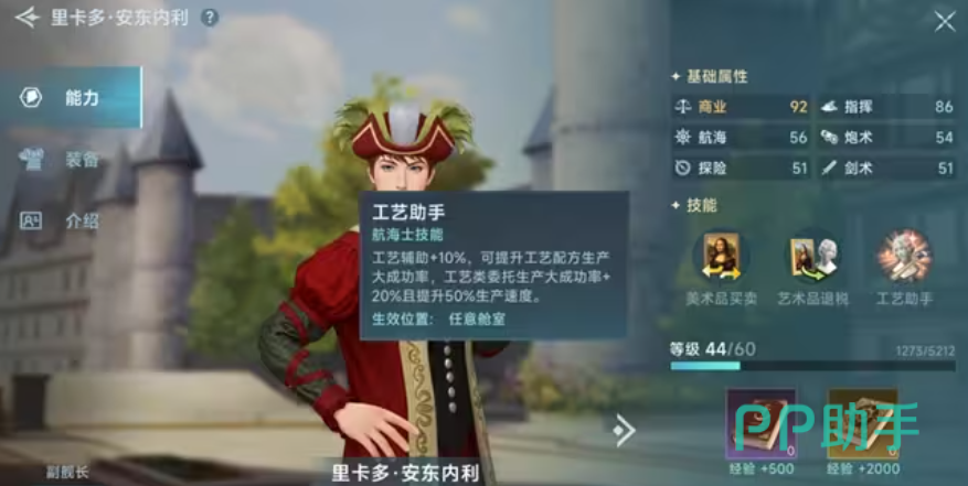 里卡多会在获得东地中海入港许可证,并完成未决的胜利后加入队伍,他的重点技是“工艺助手”,这个能让工艺辅助加10%,提升工艺配方生产大成功率,并让工艺类委托生产的大成功率加20%且提升50%生产速度,要知道在游戏中带这种辅助技的航海士非常少,尤其是大成功率会受到各种因素的影响,所以当我们将里卡多升级到41级,解锁工艺辅助后的加成,对我们而言非常关键。