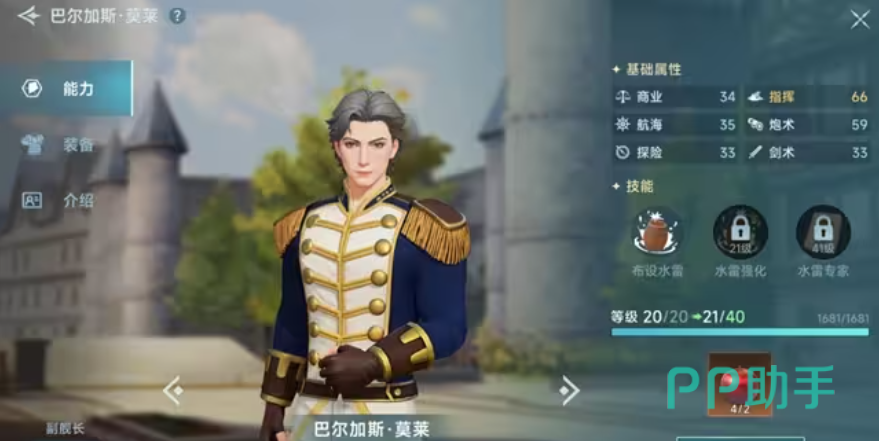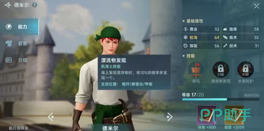 当大家获得西地中海入港许可证,并做完正义与强权任务后,德米尔会加入我们的队伍,他的定位属于辅助,“漂流物发现”能在海上发现漂流物的时候,有10%的几率多发现一个,这个可以与中后期改造船只的高级监视台进行搭配利用,“水雷防护”,能防护擅长水雷攻击的玩家,由于其技能方面没有太大的亮点,所以不太推荐大家优先培养。