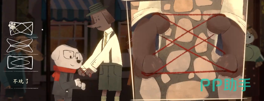 到面包店门口后会发现水果店老板正在和人吵架,两人都在说对方的车撞了自己的,导致我们去朋友家的路被封,这里先和事故旁边的两位侦探对话,他们对事故原因有结论,但是需要我们自己去找几个线索,我们先点击撞车的小灰能得到第一组线索,再点击一下相撞的车能得到第二组,然后到面包店门口和带绿帽的先生玩翻花绳,记住第一次翻选第一个选项,第二次选选项三,第三次选第一个就顺利获胜,赢了后他会把花绳送给我们,然后走右边来到后面的小巷。