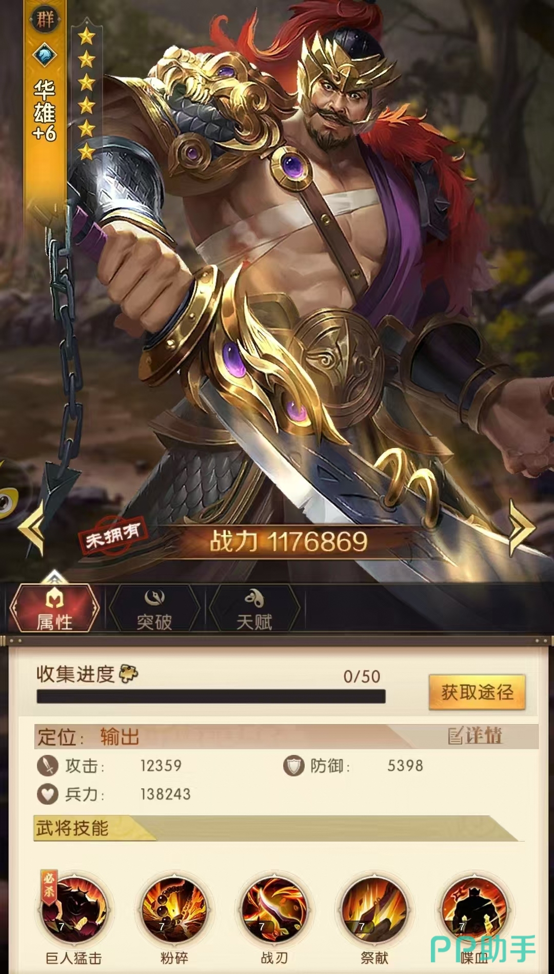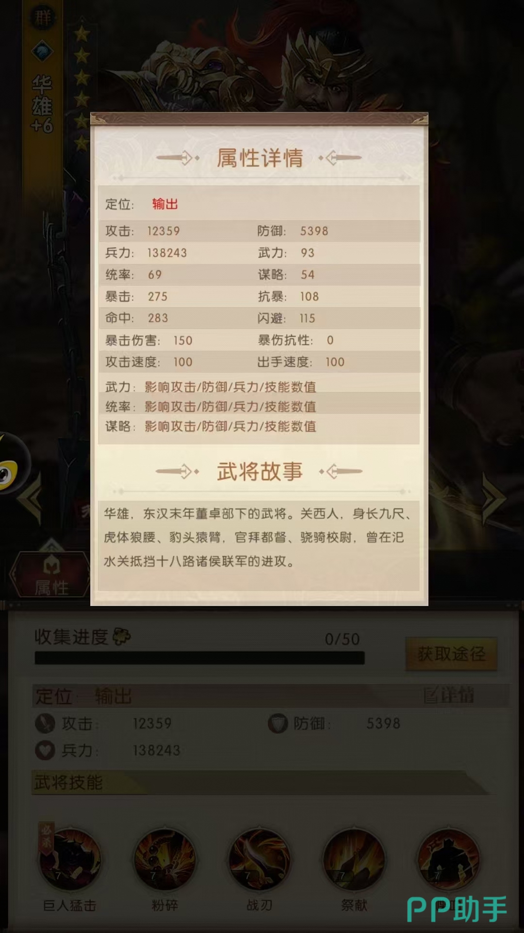 华雄角色的阵营是群雄阵营,在游戏中也是一位橙色武将。作为骑兵他的输出能力和伤害可想而知,目前在游戏中获取该角色的方法是通过日常招募或者12软妹币充值获取。不过游戏福利很多,积攒招募令应该是能够抽取到角色的。