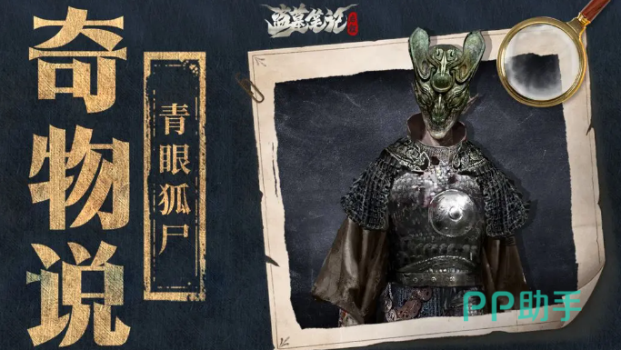 青眼狐尸是一个带着狐狸脸面具,浑身上下有盔甲的男尸,它的面具下面的脸非常惨白,整颗人头上几乎没有毛发,脸庞非常尖,眼睛是一条长长的缝,据传只要看上它一眼就会被传染,脸会变得和青眼狐尸一样。