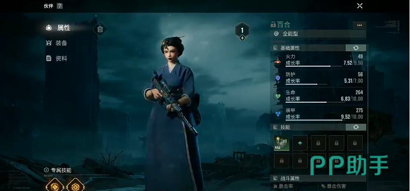 另一个专属的被动技“大器晚成”,可提高12%自身火力,生命和装甲也均得到12%的提升,副手转化率同上,但是获得的所有经验值会下降50%。从技能效果不难看出,该伙伴能给敌人附加各种不同的幅面buff,让对手始终处于不正常的状态当中,这会大大影响敌方的攻击效率以及节奏,能打乱对手的策略,更好的对目标造成限制效果。