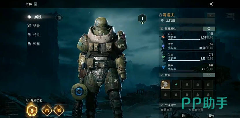 清道夫是个金色品质的伙伴,全能型的角色,基础属性来看各项数值都非常的在线,拥有三个专属技能。战意技能“战吼”,战意值达到上限后发动,恢复自身50%的装甲以及生命值,并在接下来的14秒内伤害减免提升30%,之后清空战意值,战意值是每次进入战斗后慢慢积累的。主动技“震撼打击”,使用后可发射一枚震撼弹,对8米内的目标都造成1800%的伤害,并击晕目标3秒,同时吸引范围内的目标火力14秒。被动技“防护力场”,让伤害减免提升15%。还有一个必带的5级技能“坚守”,能让火力提升100,防护提升450,副手的转化率提升0.5%。