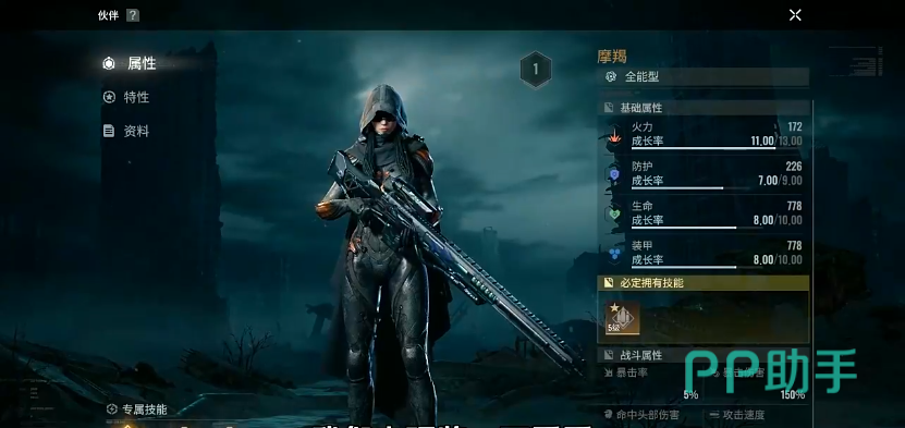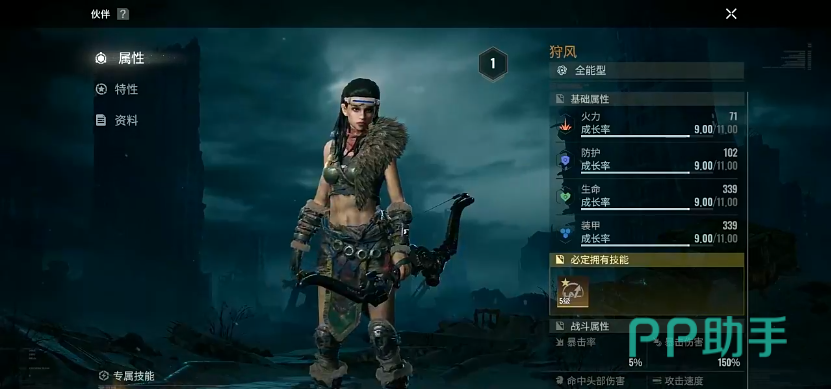 又是一个全能型伙伴,同样为最高的金色品质。拥有3个专属技能,战术技“武器超载”,在他拥有6个战术点后,下次攻击会优先选择视野中生命最高的目标,射击造成4次伤害,之后再将战术点清空。主动技“绝对专注”,在接下来的14秒内,命中敌人头部的概率提升30%,攻击速度提升30%。被动技“弱点导航”,每次射击命中目标暴击率提升4%,暴击伤害提升8%,最多可叠加3次,能持续30秒。还有一个专属被动“猛攻”,火力提高100,防护提高150,生命提升500,同时装甲也提高500,副手的转化率也增强0.5%。