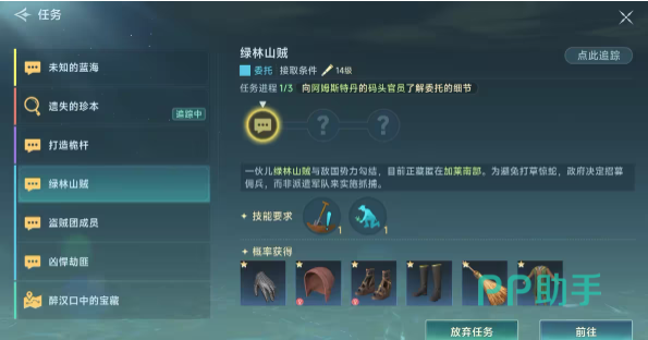 在主城任务介绍人这里能看到,有战斗,商业,冒险任务可以接,如果想要刷某一系列的任务,就直接点击任务栏下面的小齿轮,里面就能看到当前鞥能刷的坐高任务等级,直接勾选想要刷的任务就可以,而这里主要就勾选冒险类的,接取的上限是24级,上限是可以通过组队来获得更高的上限的。任务界面右边可以查看任务的详情,比如目的地,目标,会掉落的物品装备之类的,技能要求,以及采集最低技能要求都是能看到的。在接取任务后,可以在任务列表看到该任务的流程,所有的冒险任务,在讨伐之前,一定要先去找码头官员兑换,之后再去对应地图战斗,能避免白跑一趟。