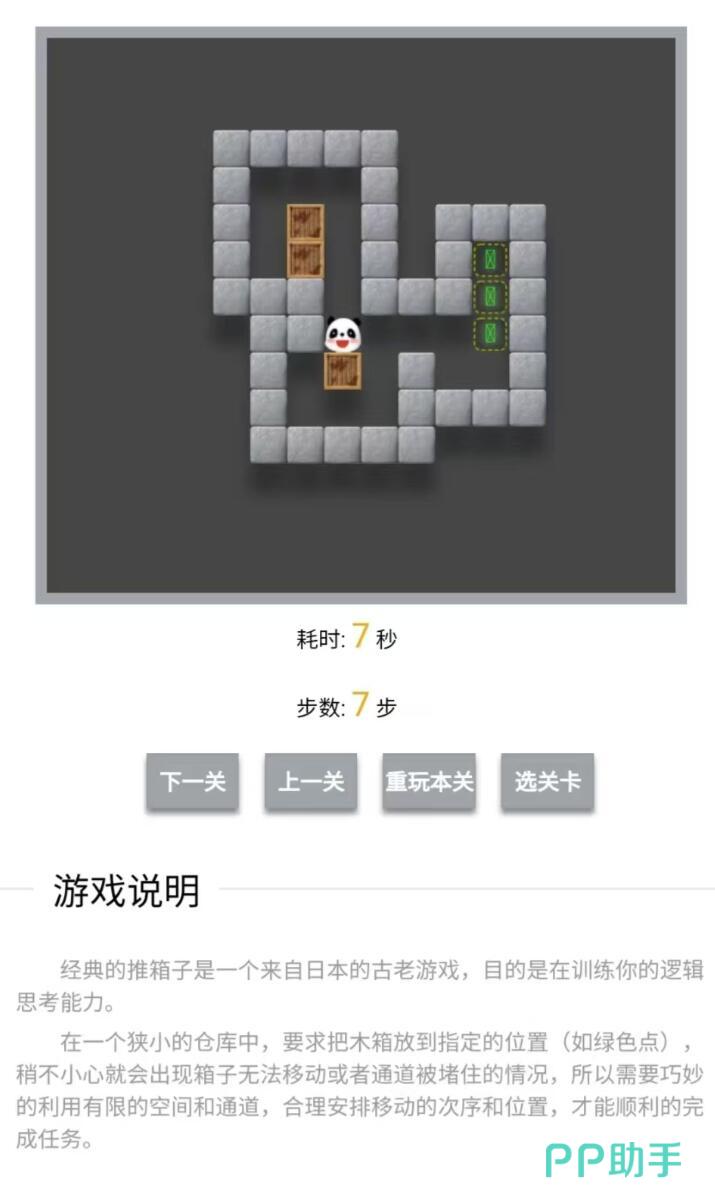 传统推箱子玩法,将玩家扔进错综的仓库迷阵。每关需将木箱精准推到目标点,但箱子只能前进无法后退,一步错可能导致全盘卡死,特色在于非常专业的传统训练模式,我们不仅能在游戏中破解难题,更有计时、步数统计能元素,非常适合硬核推箱子玩家。