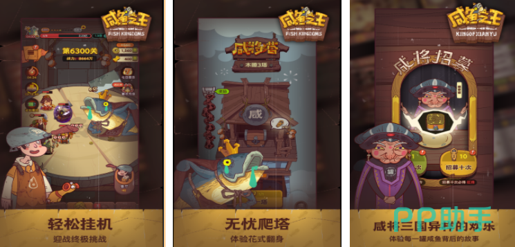咸鱼之王是一个设定非常有趣的游戏,里面会呈现出一个动画三国世界,所有的武将包括角色都会变成咸鱼形象,玩家需要做的就是操控这些闲鱼武将,不断在游戏里开启一场爬塔挑战,在这个过程中,还会遇到很多邪恶的咸鱼,玩家需要不断排兵布阵,确保这些武将可以顺利击退邪恶的咸鱼,这样才能守护这个世界的和平。
