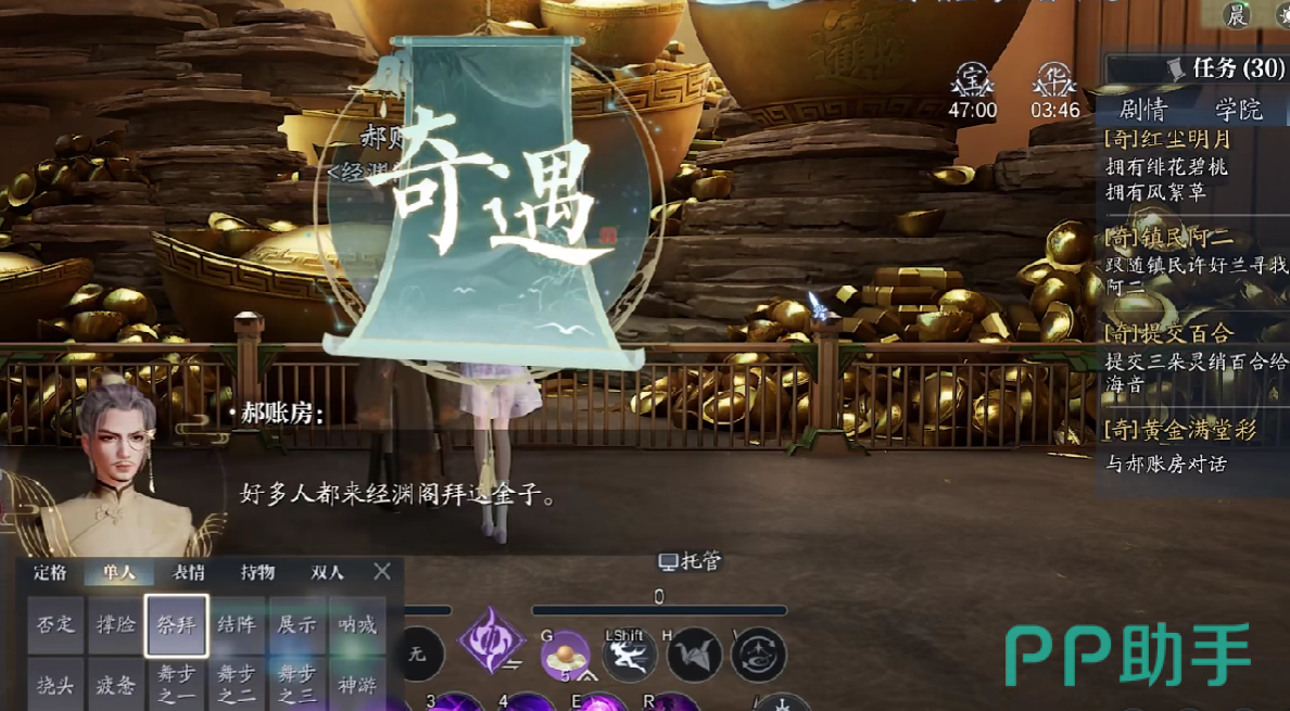 玩家进一步祭拜,还能够继续获取奇遇任务所需要的道具,当收集了两样道具之后,玩家就可以获取NPC的对话,从账房管理员口中,得知有很多人已经来此处祭拜了,并且账房管理员,还会交付给玩家一把钥匙,玩具可以通过钥匙,进入到天音寺的库房当中,获取最终道具。
