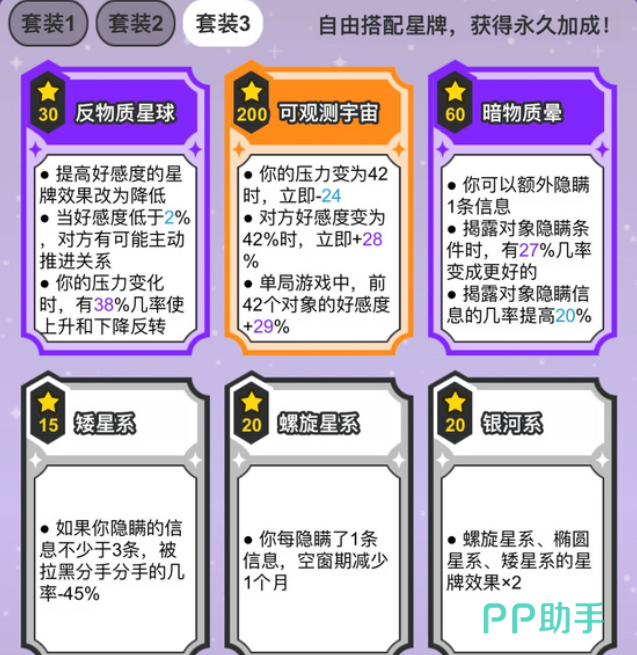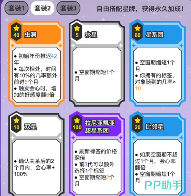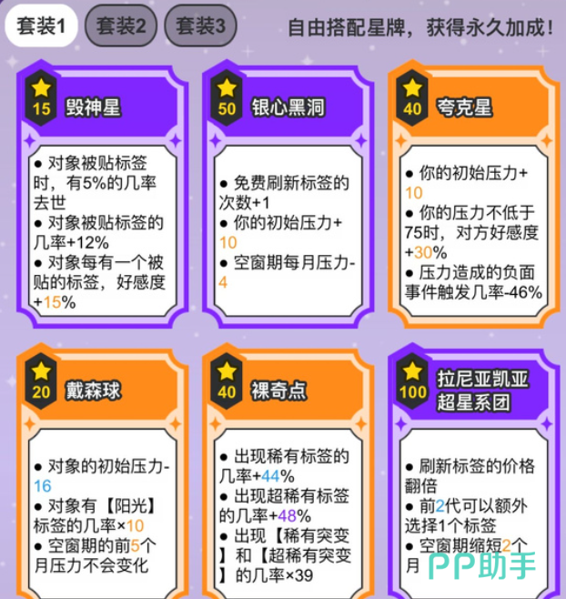 核心是毁神星以及橙色的银心黑洞,这一套新牌流派,会使得玩家的空窗期压力增长数额为零,所以可以不断地切换人员,通过增加前任的标签,就可以直接提升对方的好感度,从而增加自己在相亲市场当中,被青睐的概率。