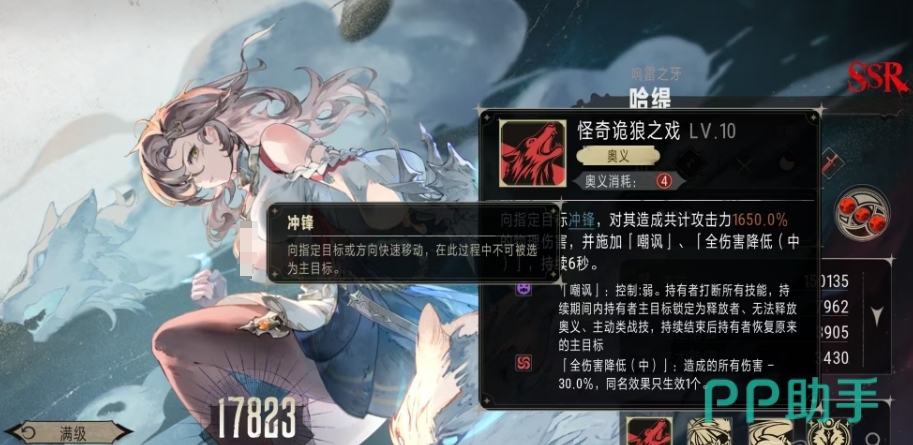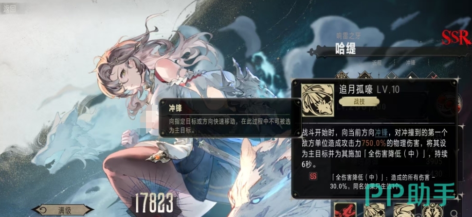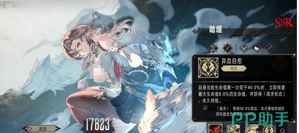 另外哈缇还有一个强力的效果叫做血月降临,在血月降临持续时间内,他对敌人造成的伤害会提升20%,所以哈缇作为一名SSR品质的角色是有足够的基础数值可用的,而当哈缇在战斗中遭到对方攻击后,血量降至残血状态时,其实并没有太大的危险,因为他所带来的高额吸血能力,完全可以通过自身的输出将流失的血量吸回来,所以在续航方面的表现还是非常出色的,再来说说哈缇的战技叫做追月孤嚎,当战斗开始的时候,他会直接朝着当前方向发起冲锋,在这个冲锋的过程中,他处于一种特殊的状态,不可被选中为主目标,这也提高了他在冲锋阶段的生存能力。