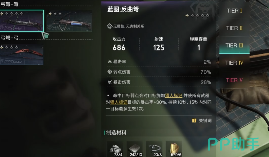 别看反曲弩的武器本省极为只是紫色的品阶,可是武器的攻击力却极为亮眼,它的攻击力已经达到了279,而射速和稳定性也分别达到了125和2%,可以说反曲弩的对敌时的攻击力是非常强大的了,最主要的是使用反曲弩时还有65%的可能性会对击中的敌人进行标记,只要标记了敌人,在对敌人进行攻击时,自身的攻击力就能增强6%,可以持续60秒的时间。