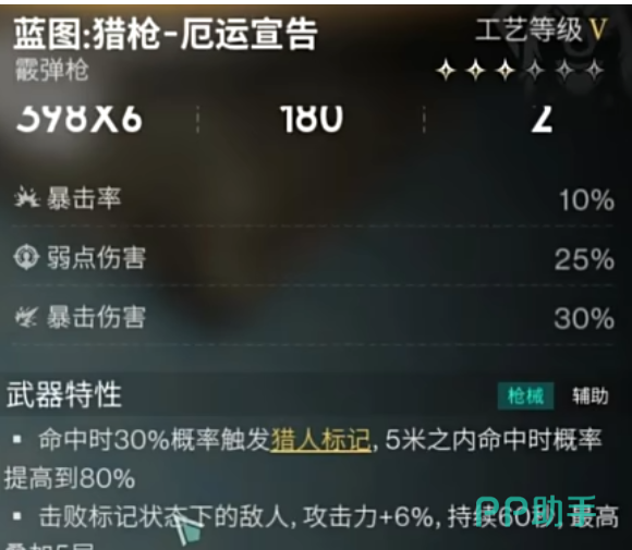 厄运宣告属于霰弹枪类的武器,这把武器非常适合在近距离战斗中使用,武器的暴击率为10%、暴击伤害30%、弱点伤害25%,高达180的射速让它在近战中可以快速的击倒对手,而且武器有30%的几率你那个标记敌人,只要标记了敌人在5米之内攻击时,命中率就会提升80%。