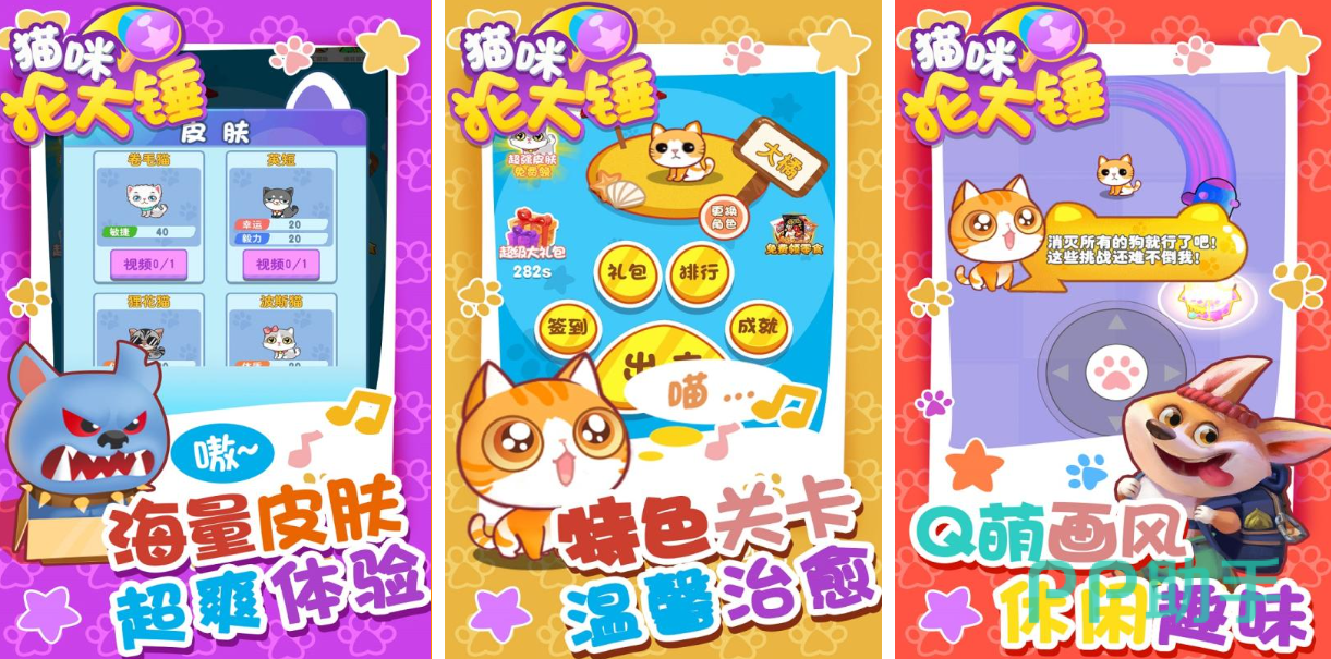 这款锤子主题的闯关游戏主角是一只呆萌的小猫,小猫猫挥动着巨大锤子看上去造型很滑稽,萌版画风跟动物元素的融合别具一格,锤子和动物的皮肤也十分多样,更有个性关卡和温馨的气氛等待着大家体验,休闲趣味性的玩法呈现让锤子爱好者乐在其中,操控拿锤子的猫猫进行互动冒险的感觉也十分有意思。