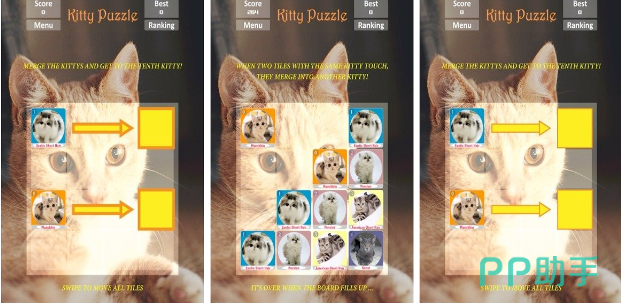 猫+猫是款将2048和猫咪主题进行融合的作品,上下左右划屏合成小猫的玩法绝对独树一帜,小猫猫的造型众多都能够合成出来,简洁美观的界面结合喵喵音效令人耳目一新,简易风格背景和简单操作也是亮点,极为逼真的小猫猫图片也让爱猫人士爱不释手,这款小猫合成类休闲作品值得大家品味。