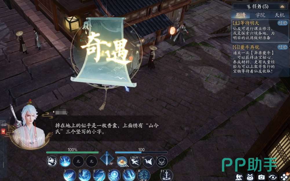 想要触发遗落香囊奇遇,玩家需前往草庙镇的特定坐标(9256,9484),到达此地后,奇遇将自动触发。此时,屏幕上会出现提示:“掉在地上的似乎是一枚香囊,上面绣有‘山今氏’三个竖写的小字。”紧接着,任务栏中会出现一个指引——[奇]寻找香囊的失主,不过,这里并没有为玩家提供具体的坐标信息。