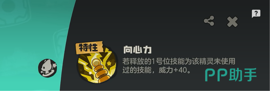 它的特性叫做向心力。如果1号位的精灵技能使用了未使用过的技能的话,就可以直接增加40点威力。由此增加其他精灵的伤害,也就是所谓主力输出的伤害。不过他的性格比较懒散,并不会直接主动进攻,需要大家鞭策一下。
