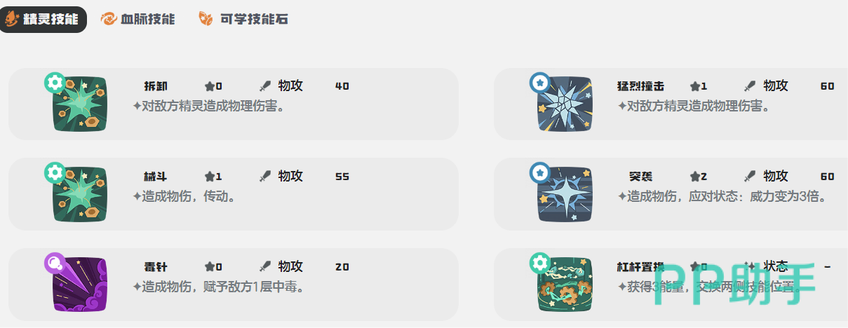 他的技能叫做拆卸,用了之后可以对敌方进行造成高额物理伤害。另外其他的技能也偏向于物理攻击,例如猛烈撞击又或者械斗。以及突袭,能够直接获得三倍的威力。甚至能够学习毒针,对敌人造成毒属性的伤害,并且可以叠加。然后还有一个功能性的技能,可以更换两侧的技能位置。