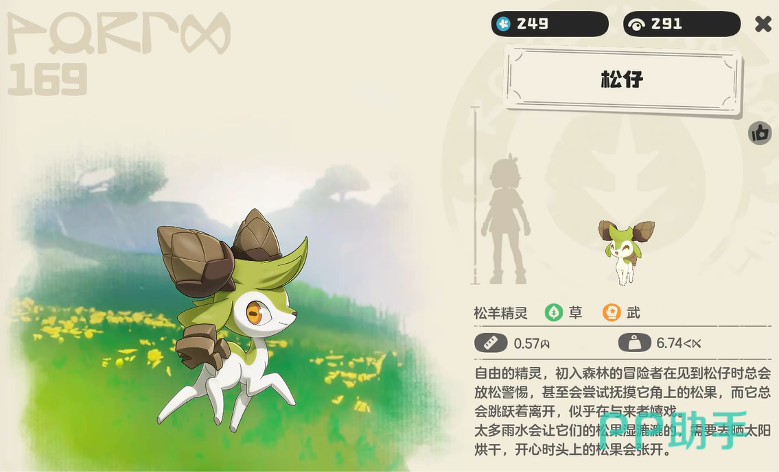 松仔是一只犹如小鹿一般可爱娇小的精灵,并且它的属性也是草属性,所以作为一只松羊精灵,一经问世就捕获了不少小伙伴的芳心。他头顶上的松果偶尔也会张开,主要是为了烘干雨天带来的雨水。另外初入森林后,看到冒险者们他也会自己离开,比较害羞。