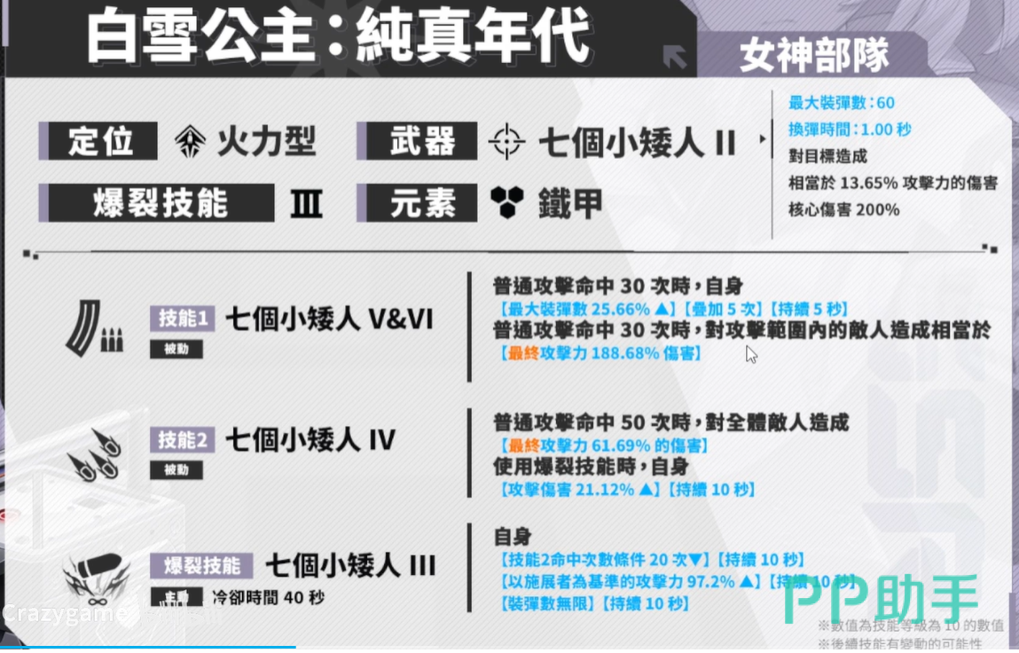 白雪公主的定位是ssr级别的角色,其属性定位是火力型,擅长的武器为步枪,这个角色一看就是输出单位,能依靠步枪打出较高的爆发。