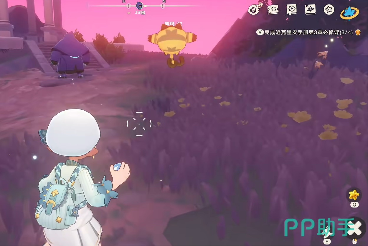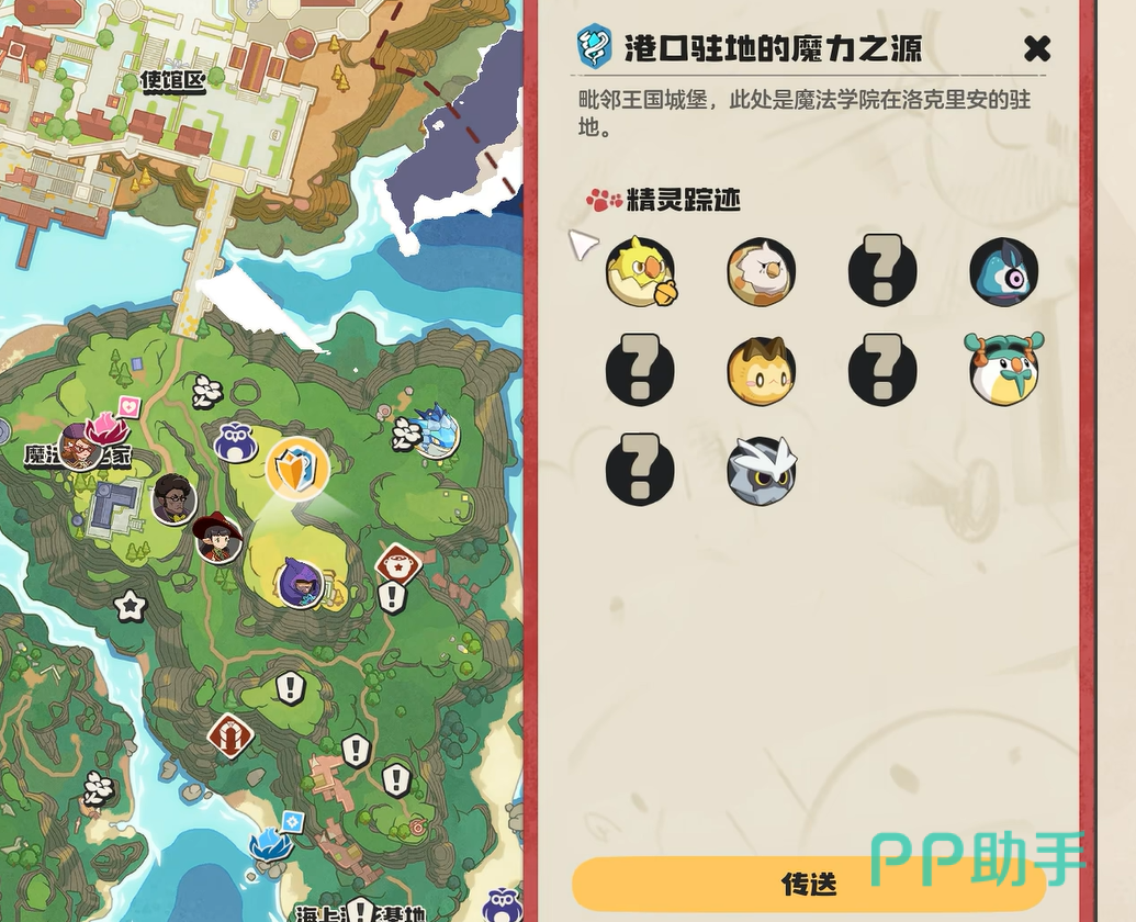 首先大家可以打开地图,然后直接来到港口驻地的魔力之源。然后后面向山顶那一边,有个小亭子的地方。大家直接跑到那里去,在这里有一个噩梦形态的梦想三三。不过它的旁边也有逗逗出现,玩家们可以直接绕过噩梦形态,在旁边就能够看到逗逗了。