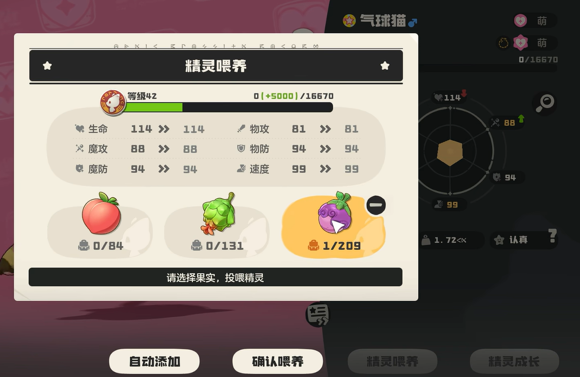 将其替换至1号精灵球位后,就可以丢出去。碰到之后就会收入你的囊中了,然后只要你不断喂养,就可以将其培养成为气球猫。整体的体型会更庞大一些,然后战斗力也更强。不过继续培养的话,那就会进阶成为梦想三三,这是一个庞大的猫咪。