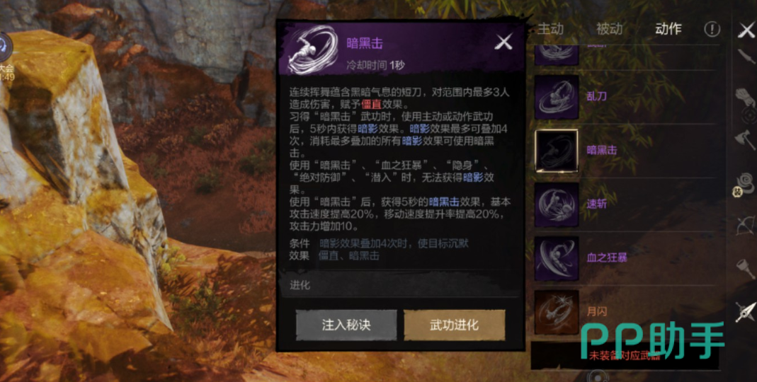 实战一般“暗袭”起手接“月闪”快速叠阴影印记,再用其他输出技能打出多次“暗黑击”,之后利用“奇袭”上Buff,释放“雷击”、“暗影封印”等技能,同时打出第二次“暗黑击”与“血之狂暴”完成爆发循环。整个过程节奏快,比较吃手法与技能释放顺序。