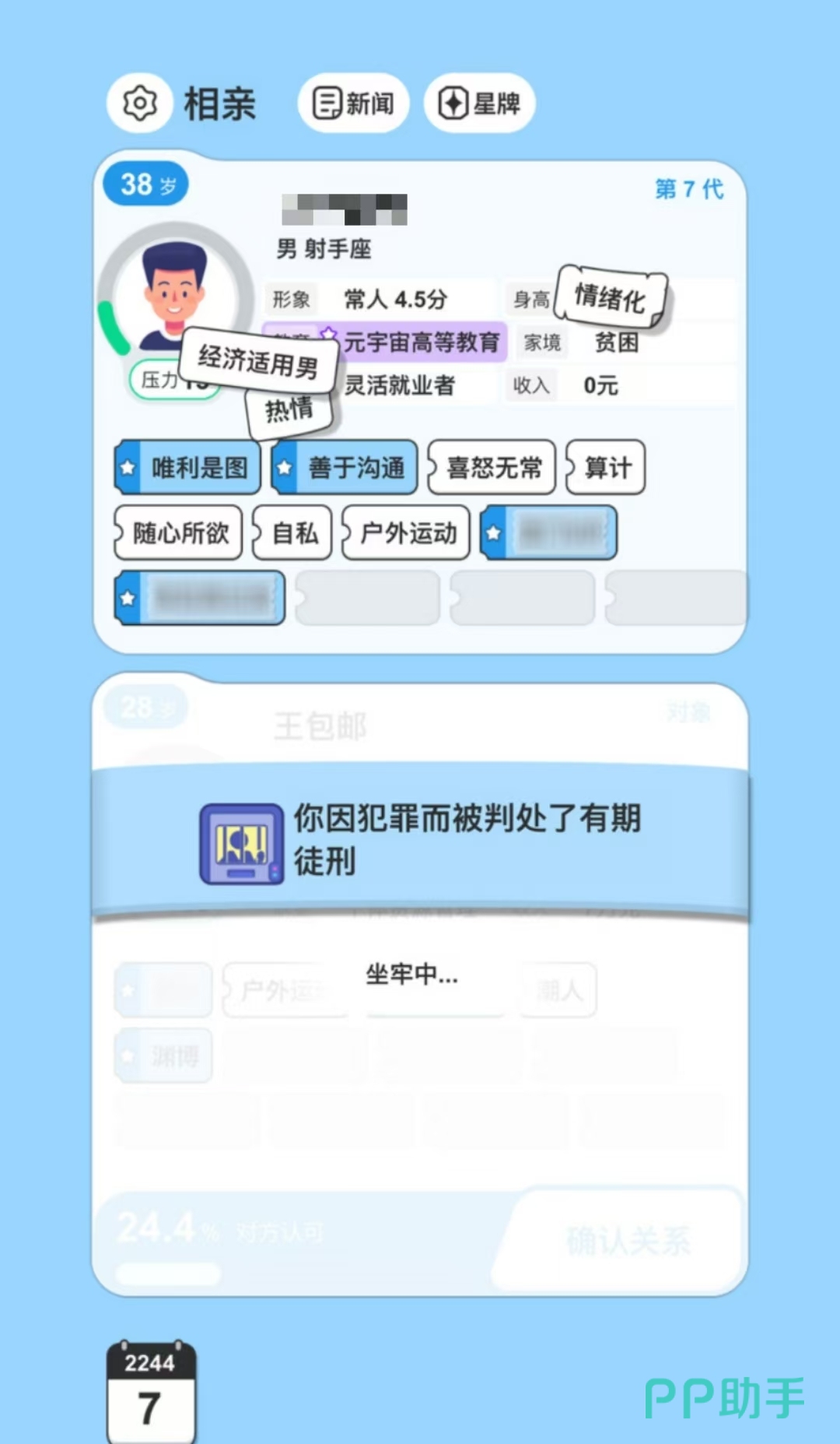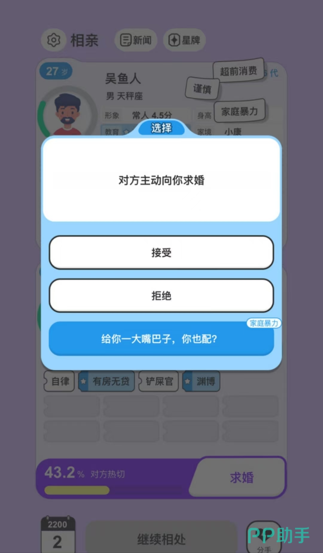 那么在这款游戏当中,玩家扮演的角色的所有属性都会随机的进行生成,这样就可以增加游戏的挑战性。那么这款游戏的角色和相亲对象都会有各种的标签,比如各种教育背景和相关的职业等等,这样可以影响大家相亲的成功率。而且每个角色都会有着相对应的压力值,这样就可能会导致相亲的成功或者失败,所以玩家需要合理的去管理自己的压力。