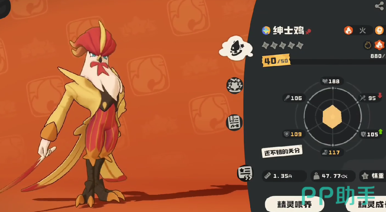 绅士鸡在游戏当中,属于火属性的高爆发性输出类角色,他擅长物理攻击和魔法攻击,基础面板拥有106点的高攻击数值,并且附带有188点的生命数值。