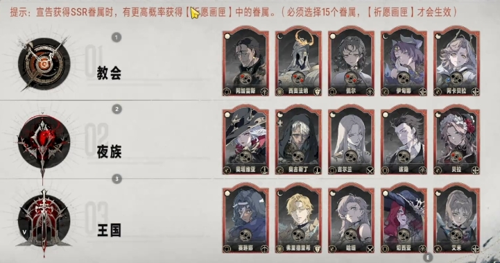 另外,在这个池子中进行抽卡还有另一个有趣的设定,当玩家累计抽取达到40次之后,将会解锁祈愿画匣功能,这是一个非常有策略性的玩法,玩家可以根据自己的需求和阵容搭配,在教会、王国、夜族三个不同的阵营中各精心挑选出5个传说品质的角色,选择完成之,一旦在后续的抽卡过程中触发了这三个阵营中传说品质角色的抽取,那么玩家必定会获得祈愿画匣中所提前选择的人物。