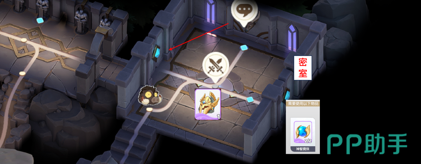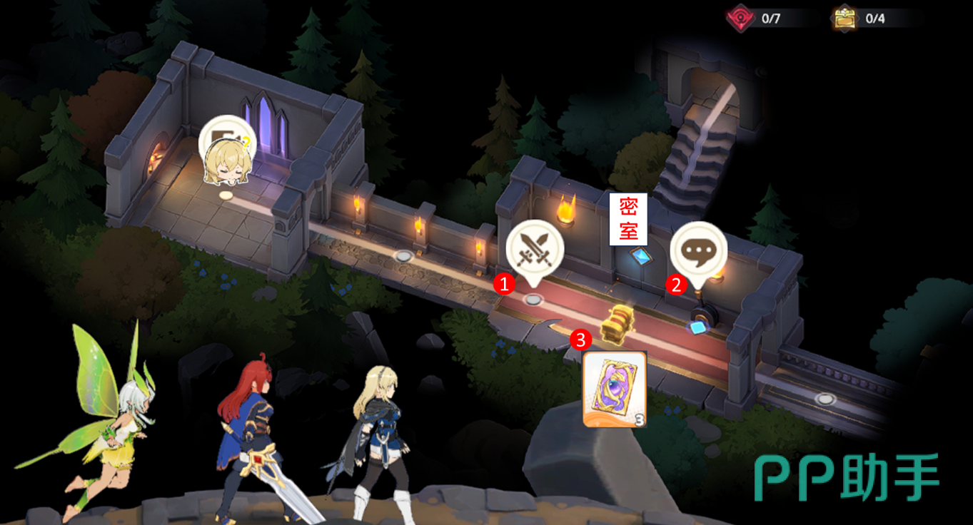 在下方区域,先前往左侧领取宝箱3,然后进入右边房间,在蓝色光球旁点击路点,可获得一个蓝色解锁道具。之后完成该区域战斗,向上进入新房间。进入后中央有一场战斗,胜利后可获得解密道具“骑士头盔”。房间右墙有一个气泡提示“扳动鹿角”,可以开启左侧暗门。右侧的暗门则需要提交两个蓝色解锁道具才能打开,需继续寻找另一个。返回骑士头盔提示所在走廊,提交头盔后开启密室,完成战斗后可获得第二个蓝色解锁道具。拥有两个蓝色道具后,返回最右侧房间,提交后打开密室,完成战斗后可领取宝箱4,至此本关探索完成。