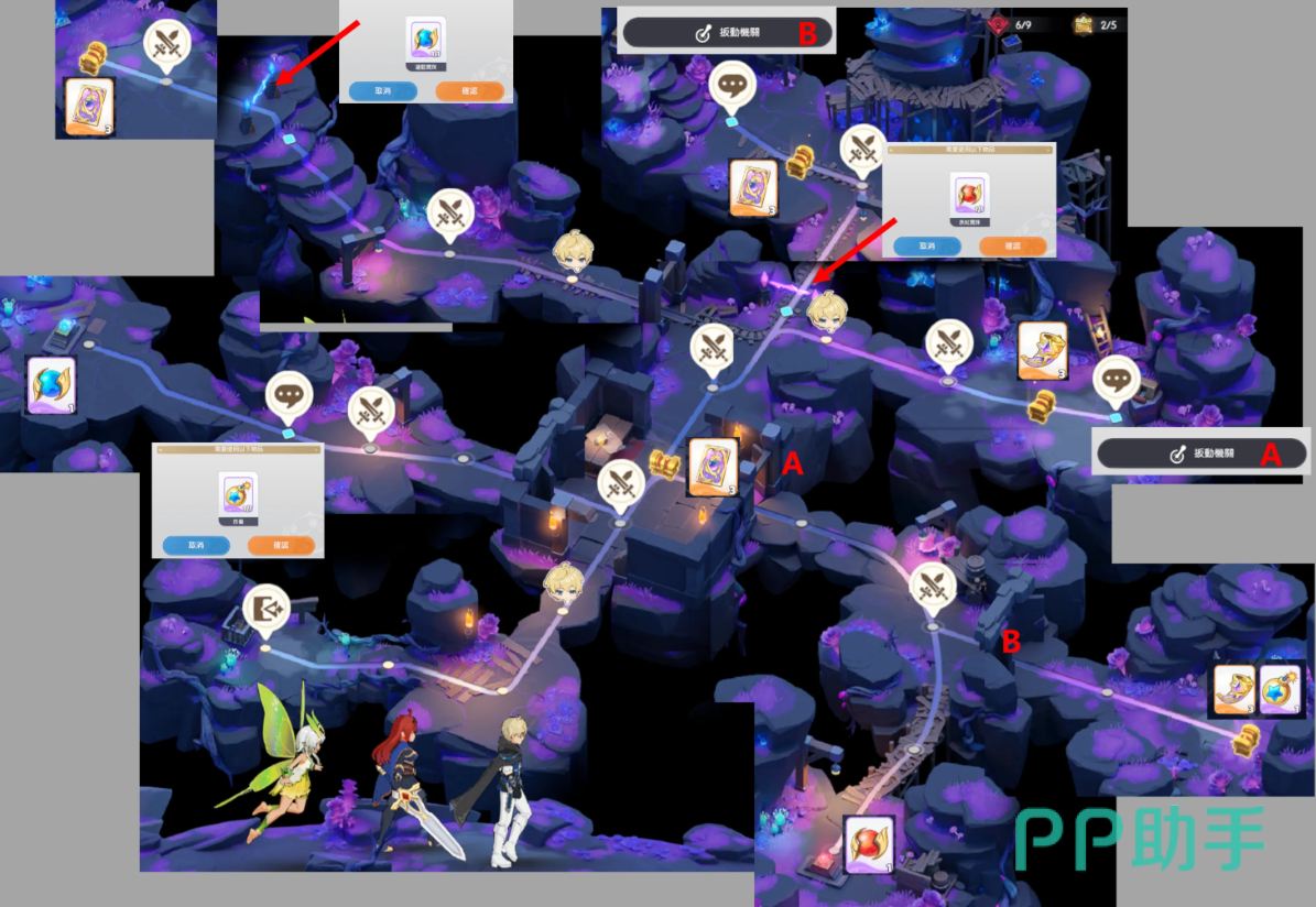 本关进入后先沿右上路径行进,打赢战斗后可获得宝箱1。抵达分岔路口向右前进,继续战斗并开启宝箱2,随后搬动机关,开启A门。穿过A门后往下,完成战斗取得红球。返回分岔路口,使用红球解除屏障,向上推进。再打赢一场战斗后可开启宝箱3,并通过机关打开门B。接着再次回到下方区域,穿越A门与B门,在里面可取得宝箱4,同时获得炸弹道具。随后进入A门左侧正对的房间,用炸弹炸开屏障,拾取篮球道具。返回分岔路口,使用篮球解除蓝色屏障,前方即为最终宝箱5所在地。