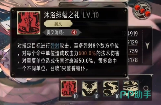 而拉米娅的奥义技能沐浴绯蝠之礼,使用的时候会对指定目标发动一次迅猛的弹射攻击,这枚携带着强大能量的攻击至多可弹射 8个敌方单位,每一个被命中的敌人,都将迎来600%攻击力的法术伤害,然而如果有敌人再次被这波攻击命中,那么他们所承受的伤害将出现50%的衰减,每当奥义技能多命中一个不同的敌方单位,一只饕餮蝠仆就会被召唤而出。