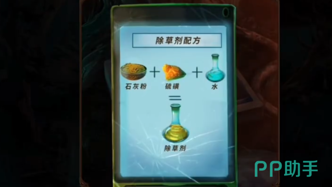 我们点击左下棋盘能得到配方,使用空水囊得到水,使用配方依次加入石灰粉、硫磺和水后能得到除草剂,继续向前走对着怪树使用除草剂,就能得到蝙蝠护身符,将其给凯特,任务就到此完成了。