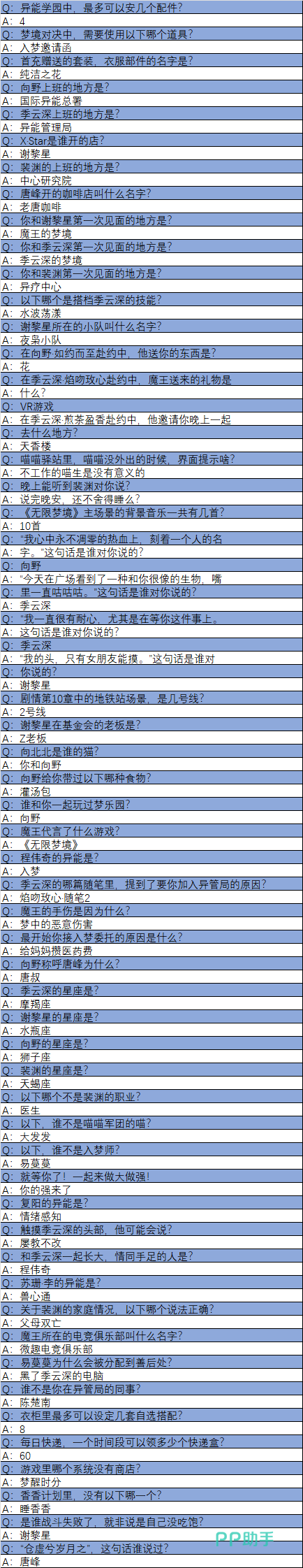 比如说异能学园里最多可以安几个配件,正确答案是4个。首充从的套装衣服部件名字是?正确答案是“纯洁之花”。唐峰开的咖啡店叫什么名字?答案是老唐咖啡。类似的题目,需要玩家对游戏的剧情也有一定了解。