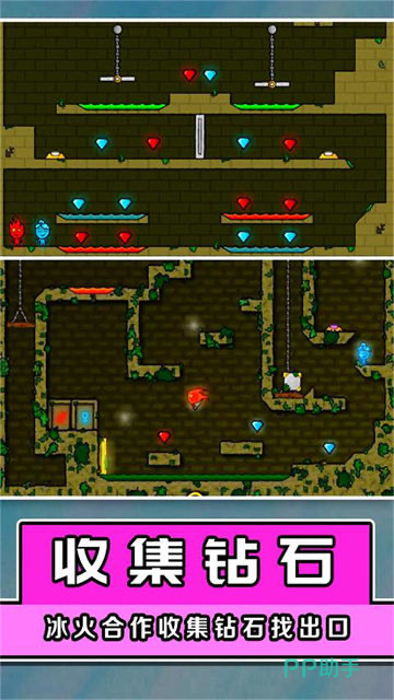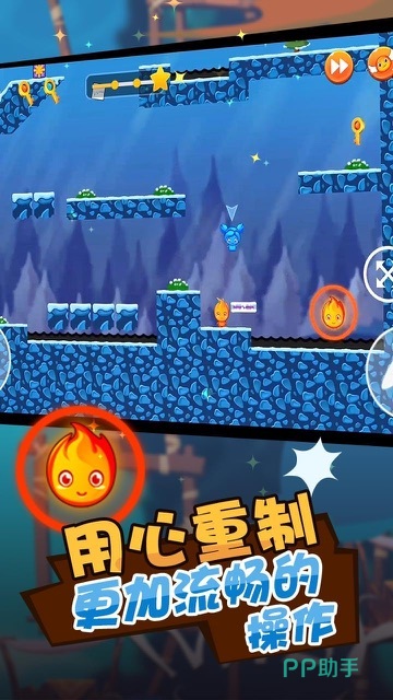 延续了冰火双人合作的经典玩法,但在细节打磨与节奏设计上更显成熟。角色形象经过重新绘制,色彩饱和度提升,使红蓝对比在动态中更具视觉冲击力。关卡结构不再拘泥于传统直线式推进,而是通过多层次机关与时间机制,营造出更具挑战性的解谜节奏。角色之间的互动更加紧密,某些场景甚至需要两人互相借力完成高难度动作。