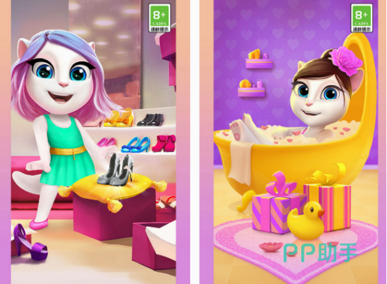 相对于单纯的化妆游戏,这款它是融入了宠物养成这种玩法的,以大家熟悉的可爱安吉拉,这一个白色的小猫咪为主角,无论你是想要让它在卫生间里面泡澡,享受惬意的美好时光,或者是穿漂亮的衣服鞋子以及打造妆容,都是可通过点击屏幕的方式做到。属于玩法非常简单,也是适合很多年龄段玩家的,并没有复杂的操作方式。