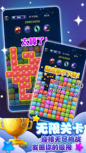 当夜幕悄然降临,万籁俱寂,你抬眼望向那片深邃的夜空,繁星闪烁,仿佛在诉说着宇宙的奥秘,这般景象总能让人的内心变得宁静而舒畅。因此星星游戏也受到了众多玩家的青睐。只需打开游戏,沉浸其中,就能让紧绷的神经慢慢放松下来。在色彩斑斓的星星世界里,玩家只需用手指轻轻点击屏幕,就能完成一次次的消除操作。