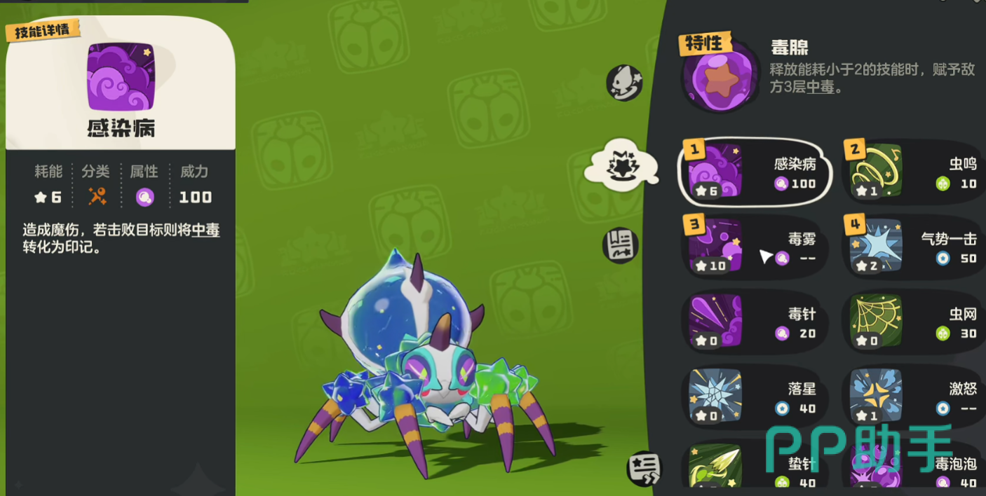 芋香巨角蛛的技能核心在于毒属性技能的持续伤害与控制效果。推荐的基础搭配以“毒网困缚”作为主打技能,该技能不仅能够对敌人造成毒伤,还能降低对手的速度,使其难以对抗芋香巨角蛛的持续压制。“剧毒喷涌”则是另一个必备技能,这个技能能够造成较高的毒系伤害,并有一定概率让敌人进入中毒状态,在面对高血量目标时尤为有效。由于芋香巨角蛛的生存能力较强,它可以利用这些技能与敌人进行拉锯战,确保对手在不断被削弱的状态下失去战斗能力。