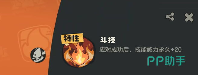 它的特性叫做斗技,当你成功应对敌人的攻击时,就可以永久的提升20点的技能威力。所以这是个很适合用来反打的精灵,由此可见可以在使用坦克精灵时,马上的选择切换至它。这样就能够适时的发起反攻,并对敌人造成不可恢复的伤害。